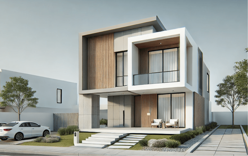 Fasad Bersih & Minimalis – Dominasi warna netral seperti putih, abu-abu, dan hitam.